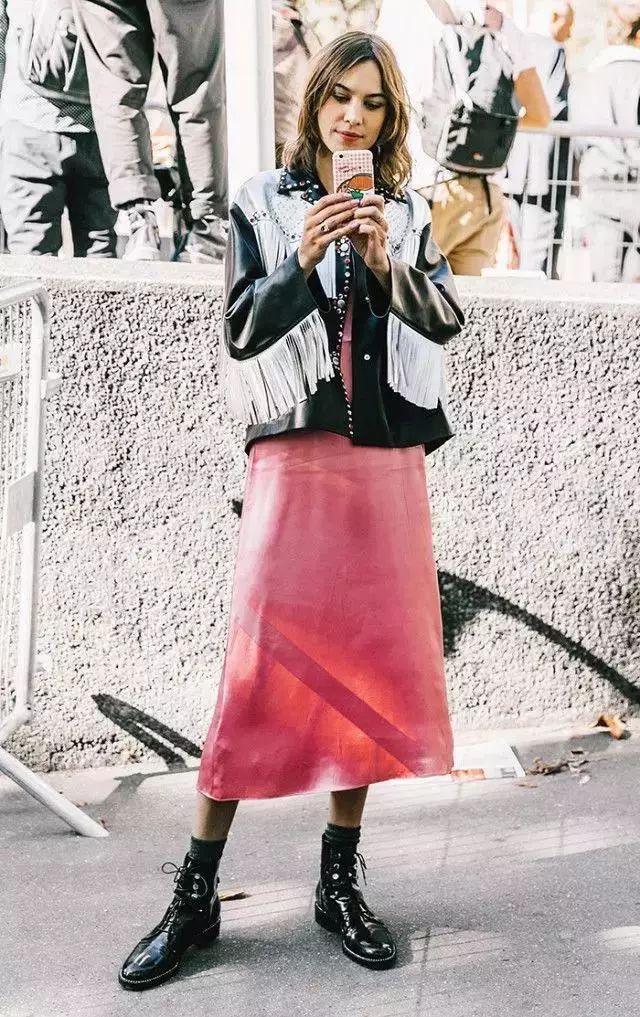流蘇皮裙搭配一件黑色衛衣,舒適有不失女人味,長長的流蘇穗在視覺上有一種延伸的效果,穿上一雙尖頭鞋就更顯高了。