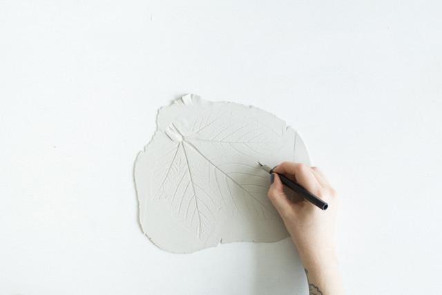 5、沿著樹葉邊緣,用美工刀去掉多餘的粘土,然後將樹葉撕下來