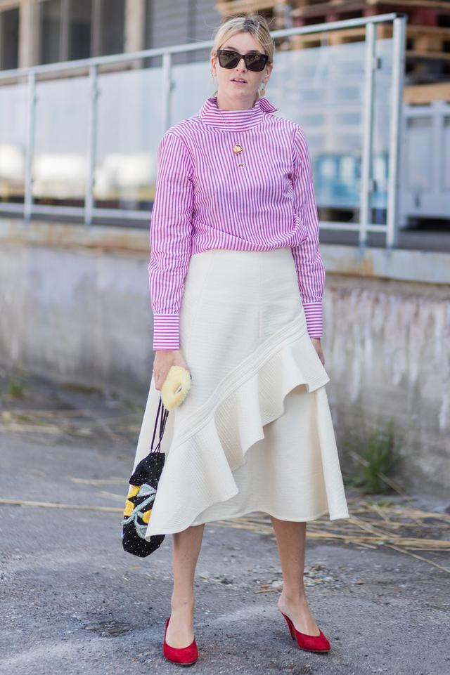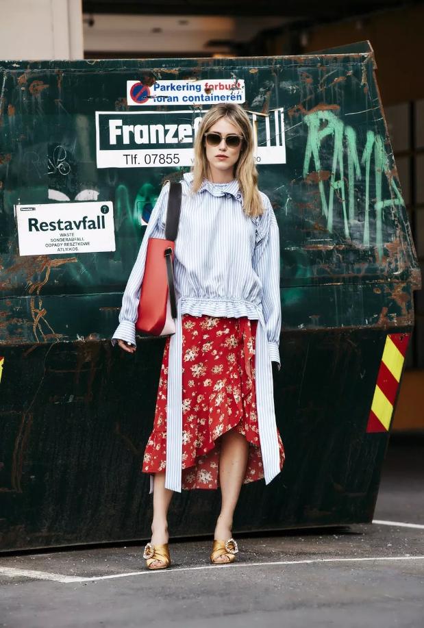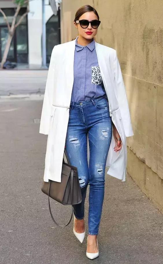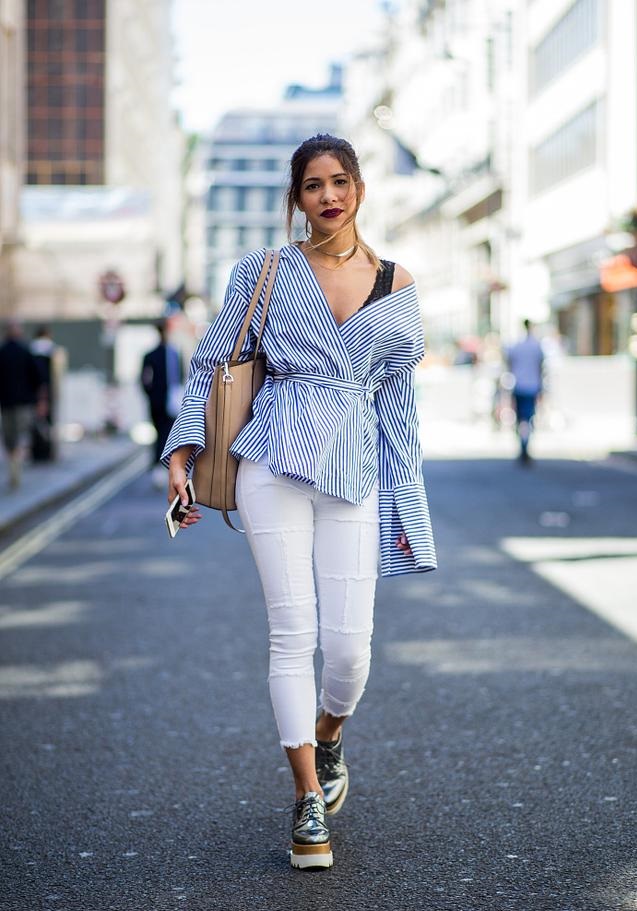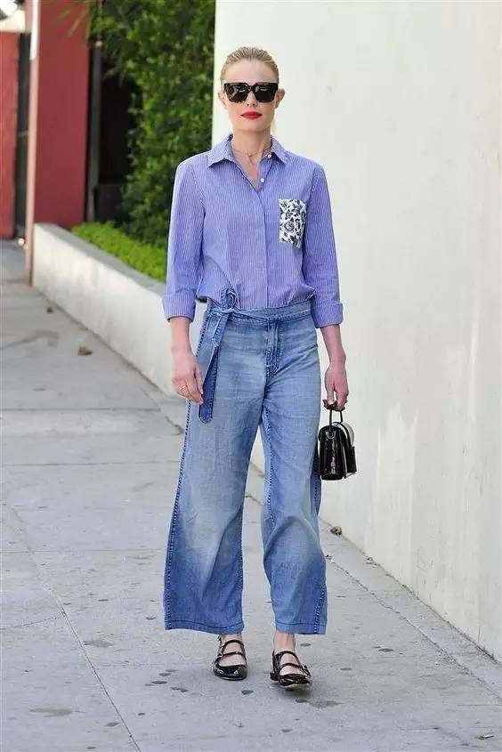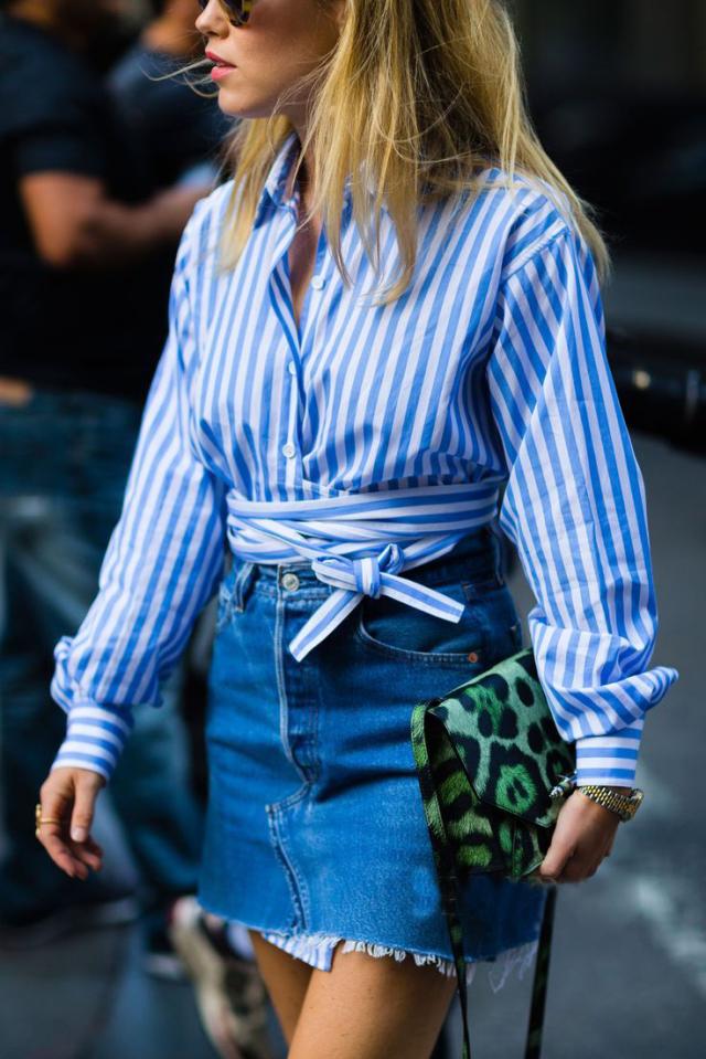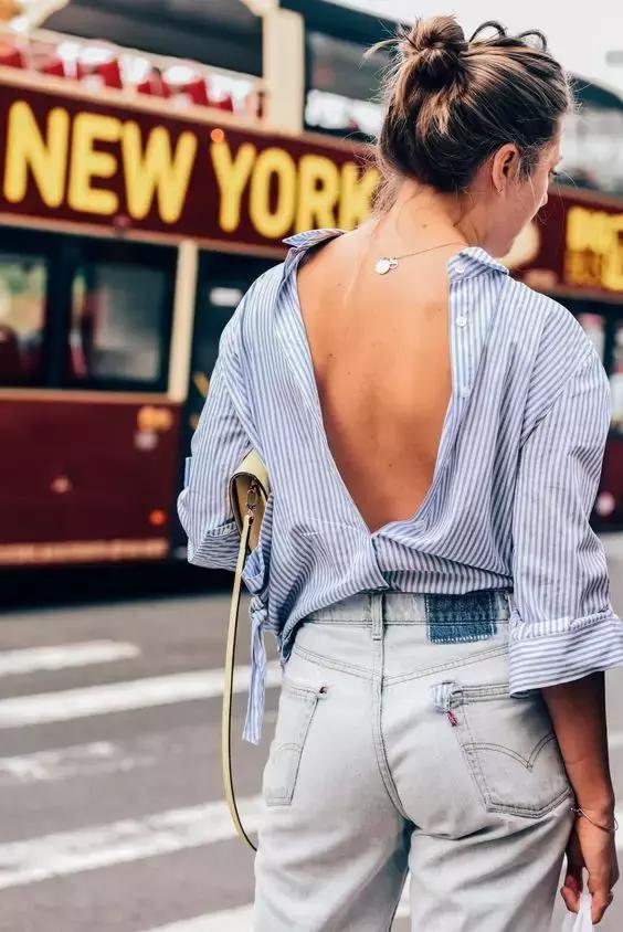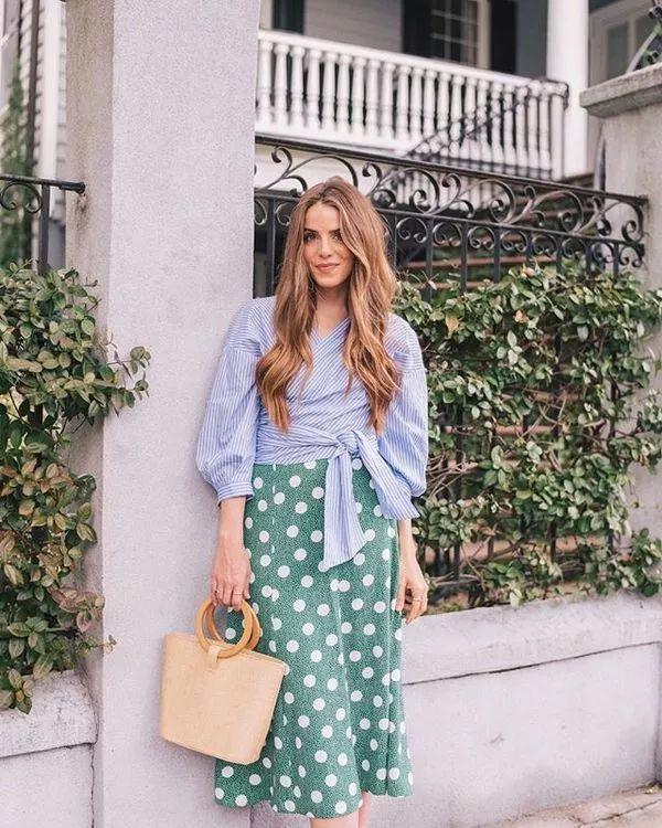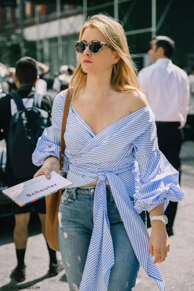 藍白、紅白條紋的襯衫春天穿很是清新,粗一點、寬一點的條紋更醒目一些,加上腰帶或者不好好穿都是搭配的技巧。