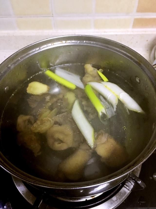 第三步:起鍋,放入雞塊和蔥薑,加水。這時候要放入開水。