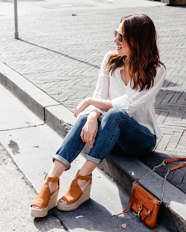 這種組合今年也很多人在穿,一件裹身式或繫帶裝飾的白襯衫+牛仔闊腿褲,