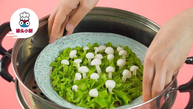 其實這道菜非常的簡單,就是把肉餡作為鋪墊,放在盤子裡,這樣可以使小小的白玉菇站住。然後燙生菜鋪在肉餡上,一道非常漂亮的白玉菇肉餅就做成了!大家在挑選白玉菇的時候要看好,好的白玉菇外形圓潤、大小均勻,通體潔白,外表沒有破損。