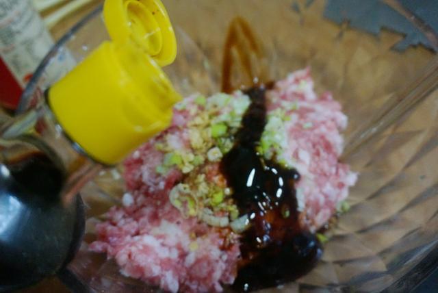 1.肉餡中加入蔥花,薑末,生抽,老抽,蠔油,蛋清,少許香油打勻。如果還覺得乾,酌情加些清水。