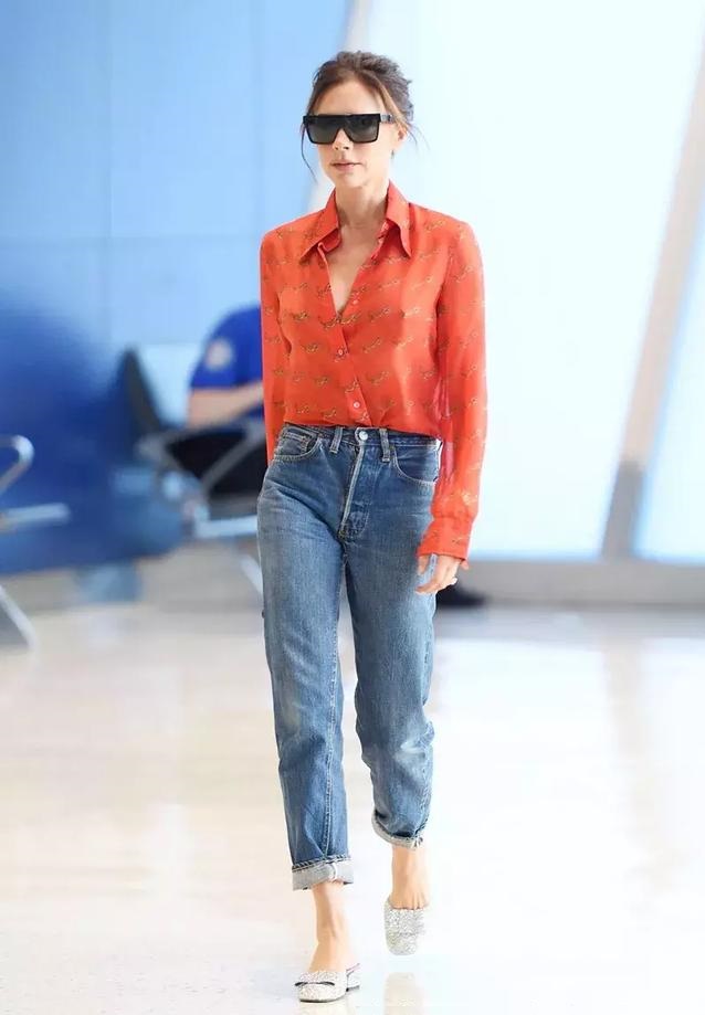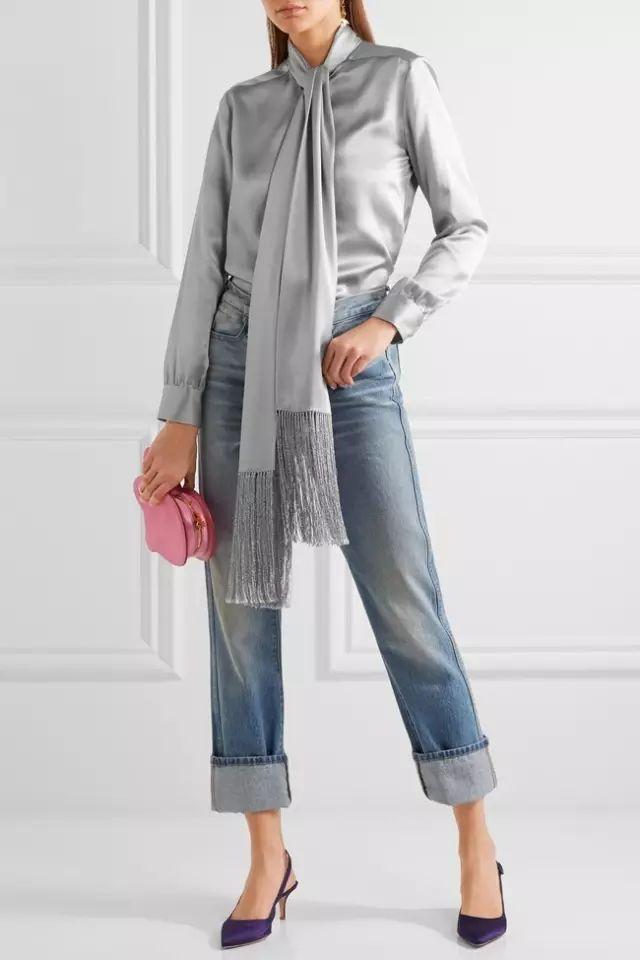 牛仔褲不僅可以凸顯幹練的氣質,更在一定程度上有顯瘦的效果。牛仔褲的提拉包臀可以使身材比例得到修飾,而絲質襯衣本身的柔和線條也是出名的顯瘦,如此搭配自然完美。
