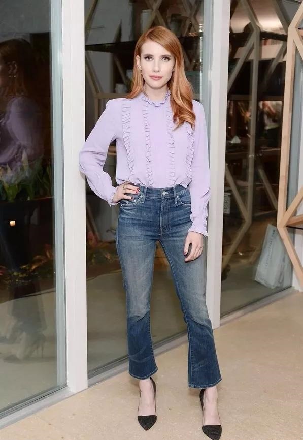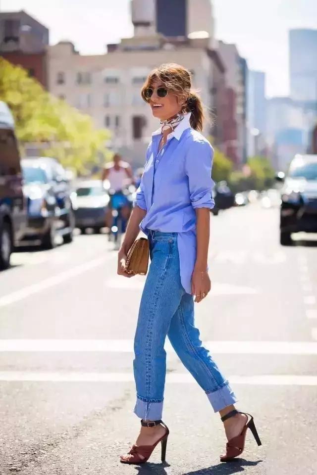 覺得白襯衫過於單調簡潔,那麼純色的襯衫搭配牛仔褲也是很有OL風的搭配,