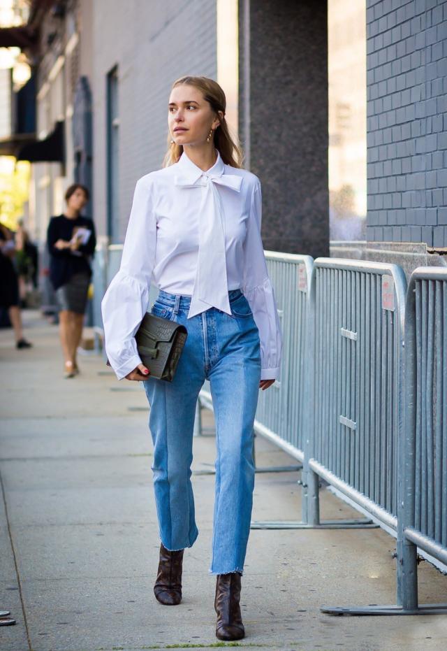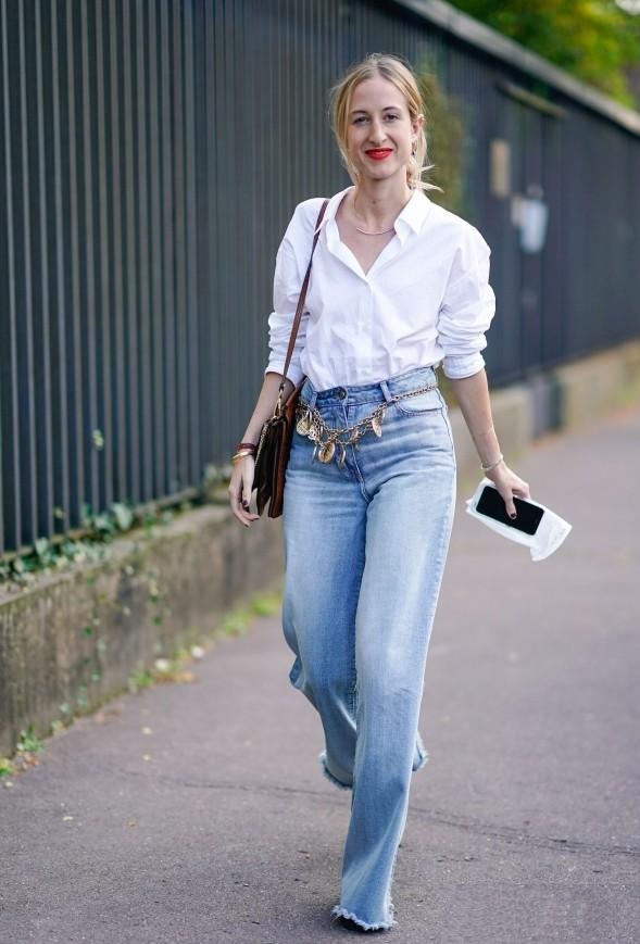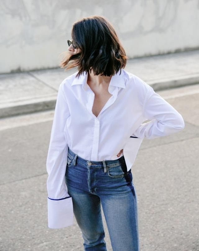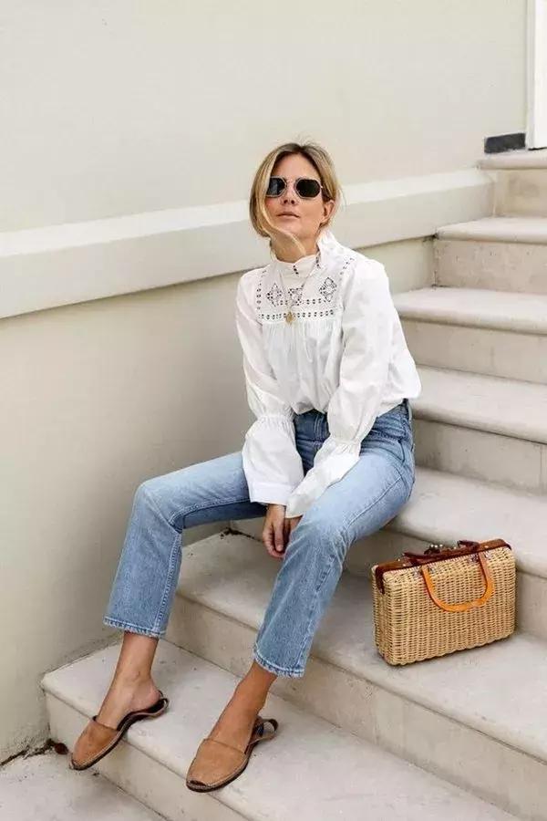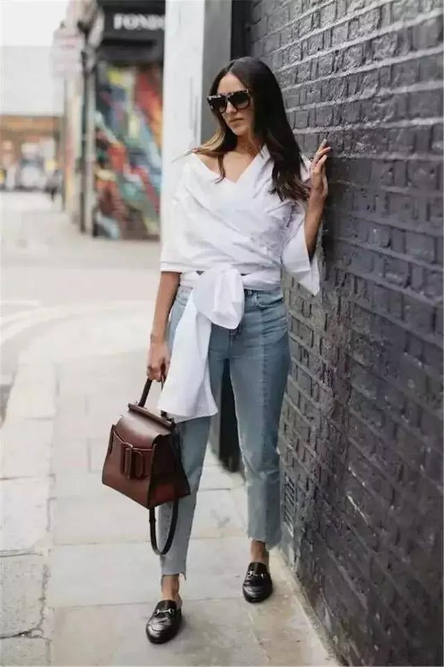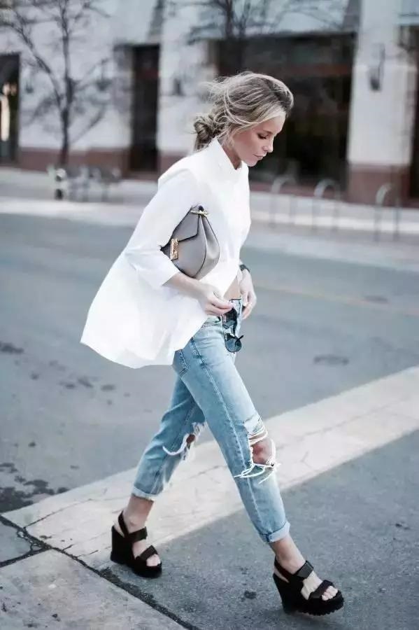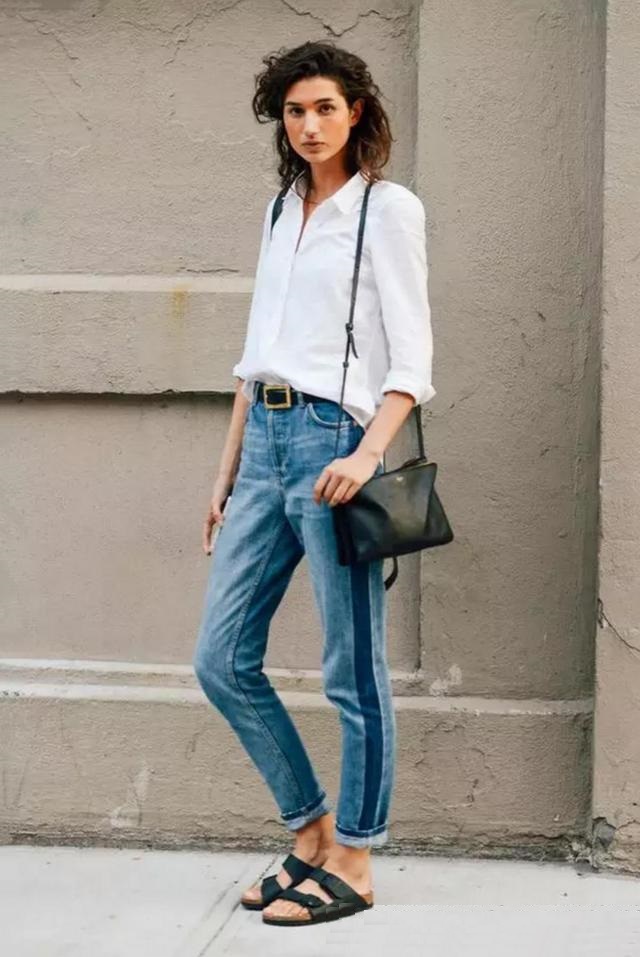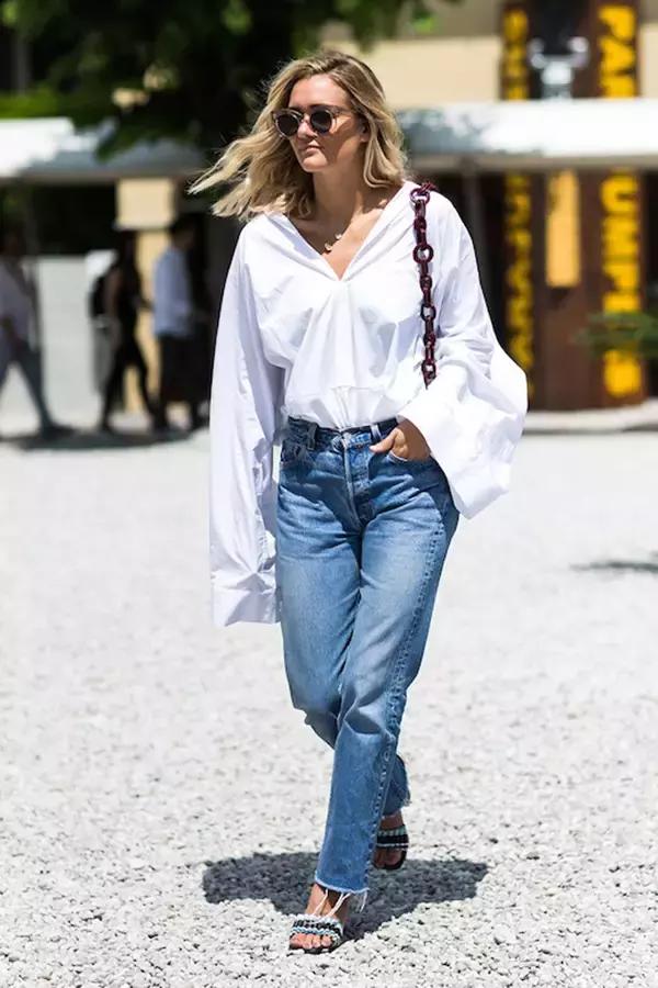 寬鬆的白襯衫搭配九分牛仔褲,