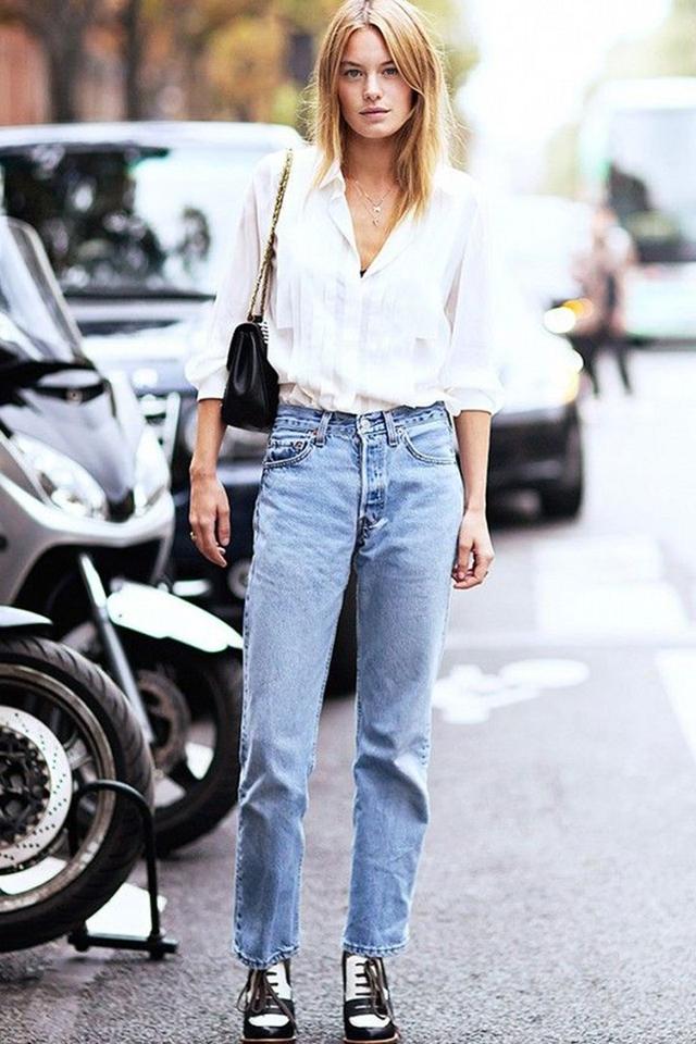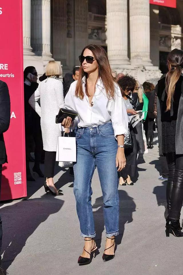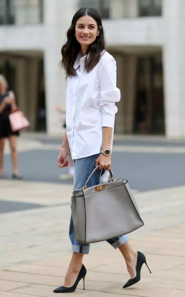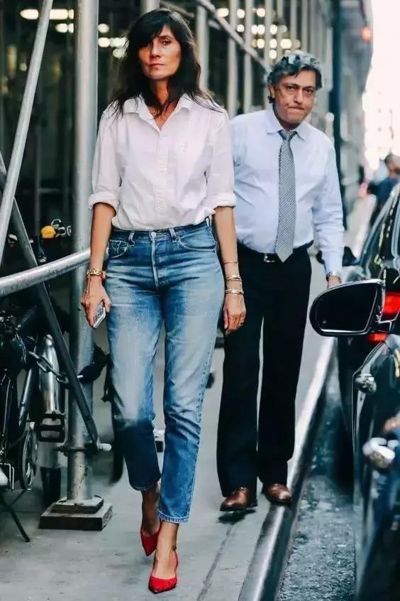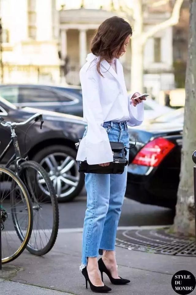 幹練的白襯衫搭配九分牛仔酷,高跟鞋穿上,優雅又大方的OL風,