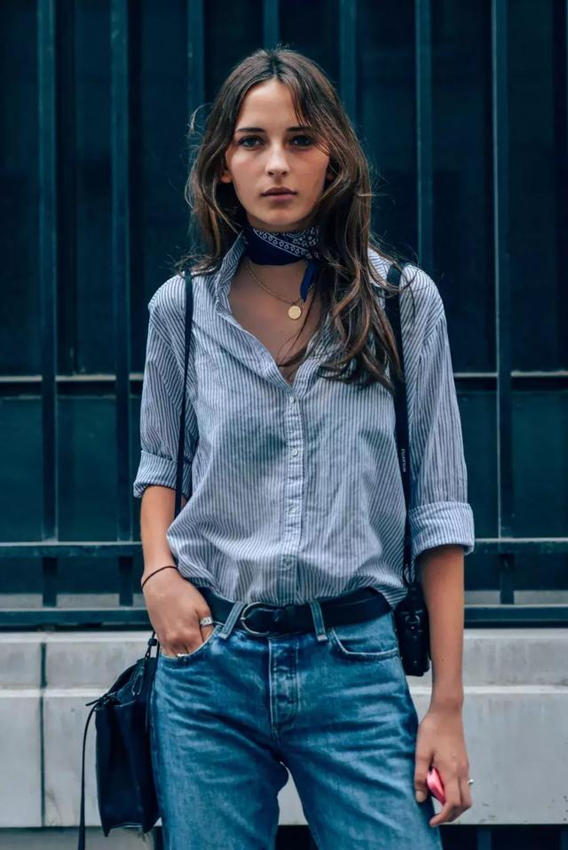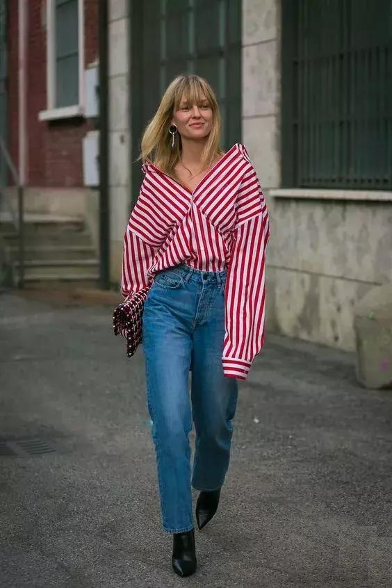 更心機一些的話,可以把條紋襯衫的一邊塞進牛仔褲內,另外一邊放在外,