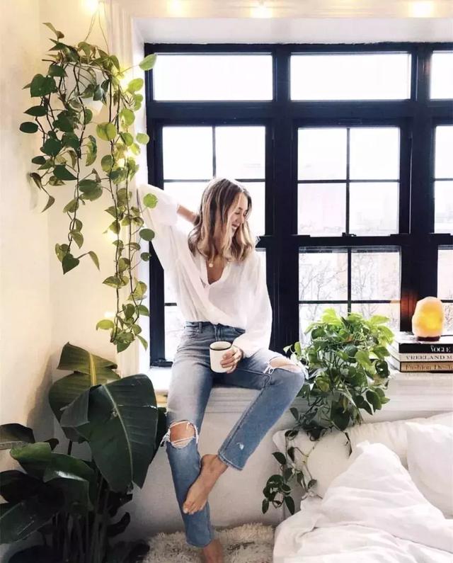 寬鬆幹練的白襯衫搭配九分直通的牛仔褲,