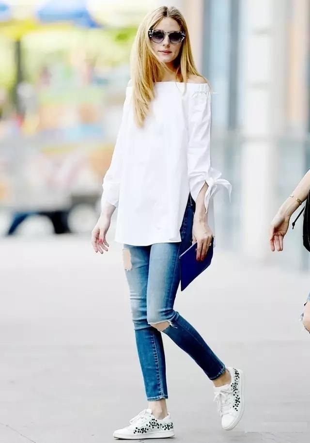 雪梨歐尼露肩白襯衫搭配九分牛仔褲,白色高跟鞋穿上,居然還穿出了甜美少女感十足的Girl~