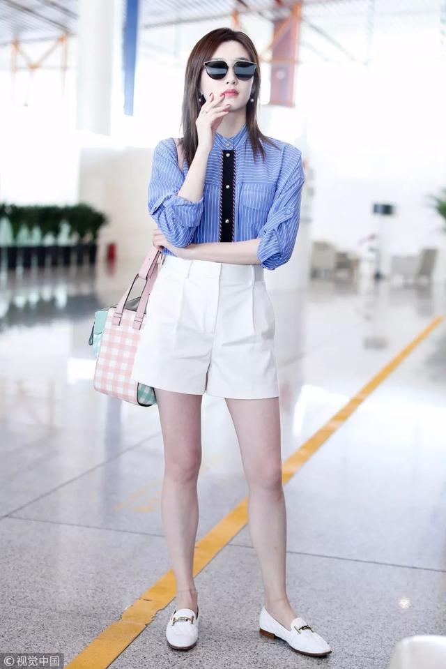 張雪迎在機場look中也示範了小白皮鞋搭配牛仔褲到底多提質感,