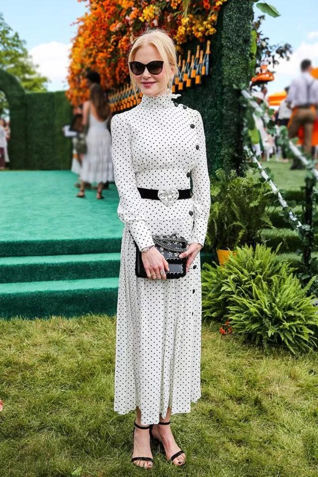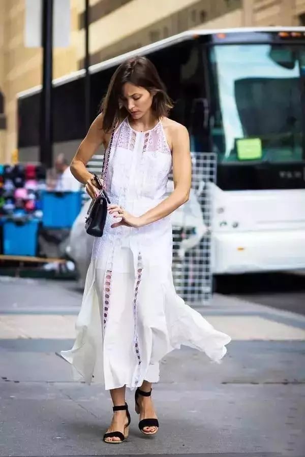 她穿了一身純白色禮服,散發著金屬光澤的高跟鞋和手包起到了畫龍點睛的作用。