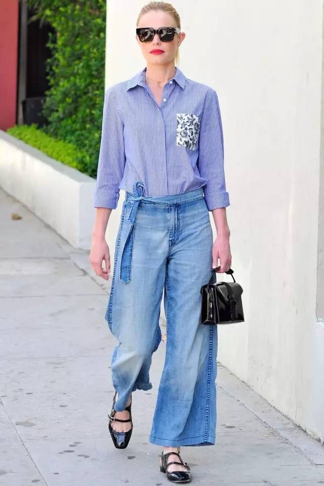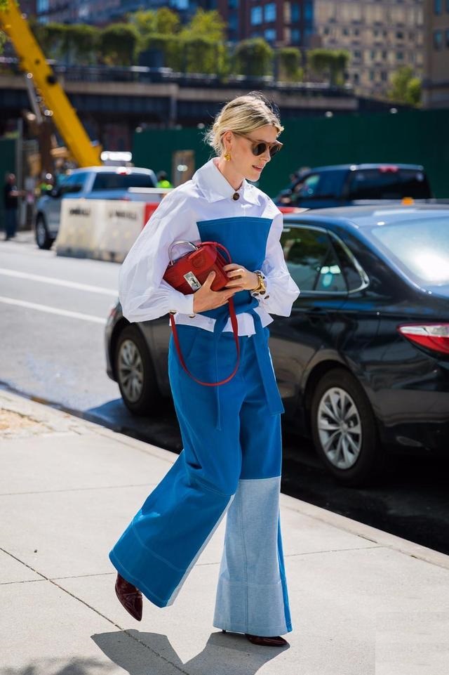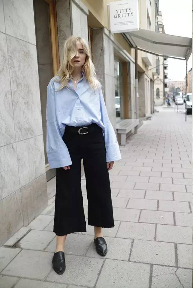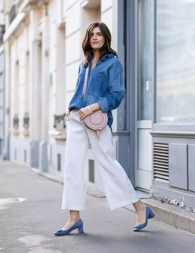 時下流行的的藍色襯衫搭配條藍色闊腿褲,man味十足,輕鬆帥過男朋友。