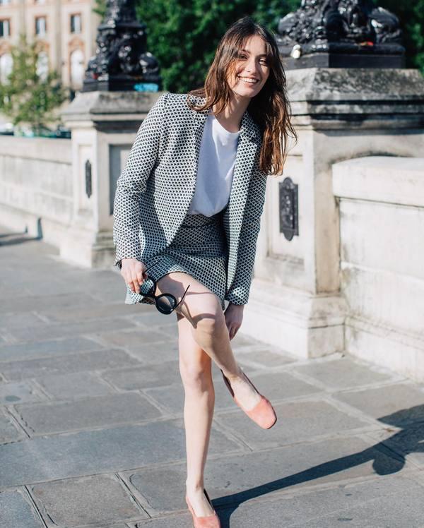 西服邊沿著裙擺貼合,帶條裙子帶件外套足夠啦。