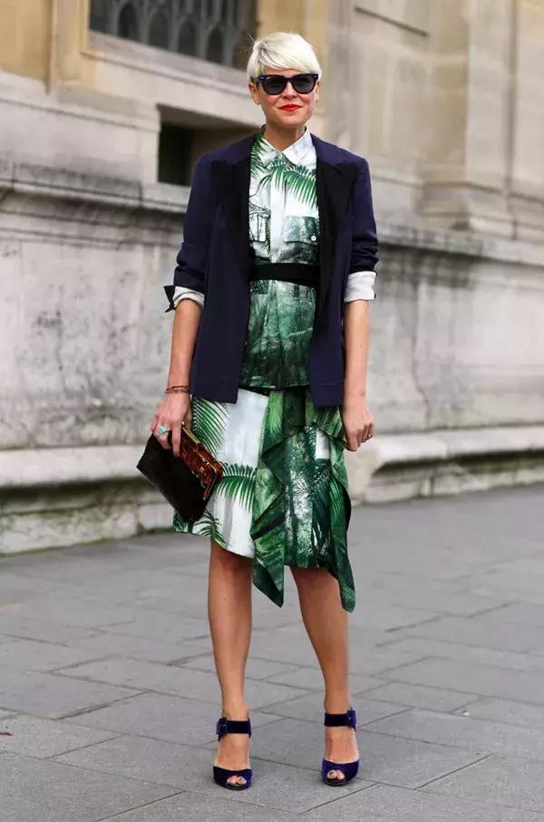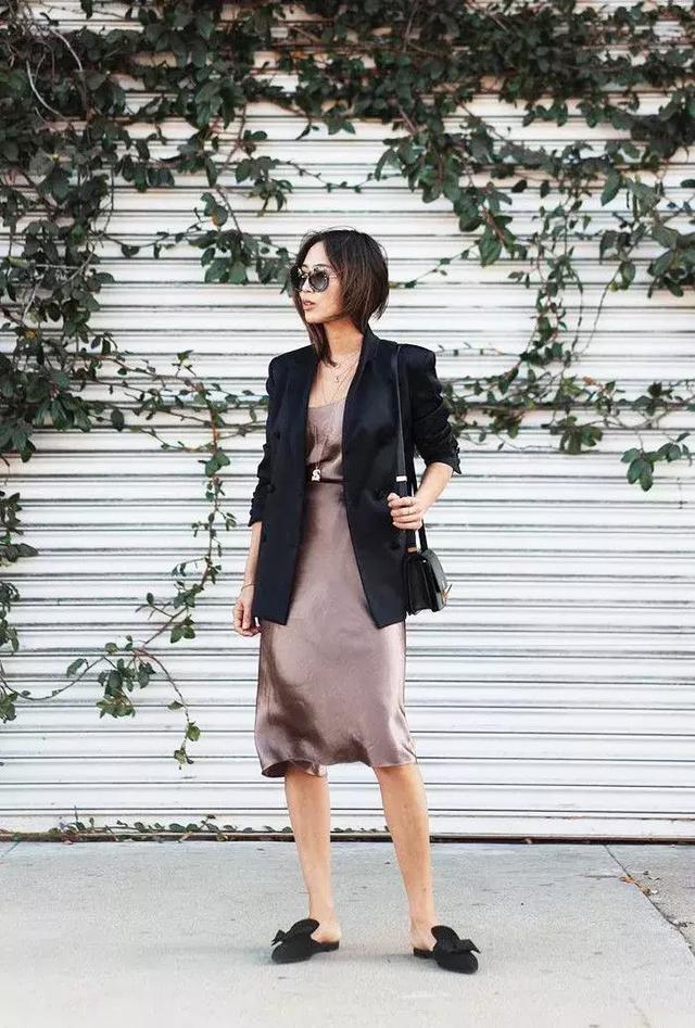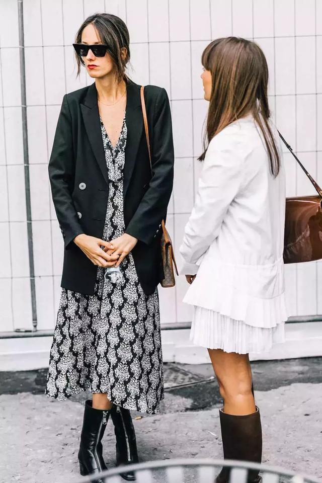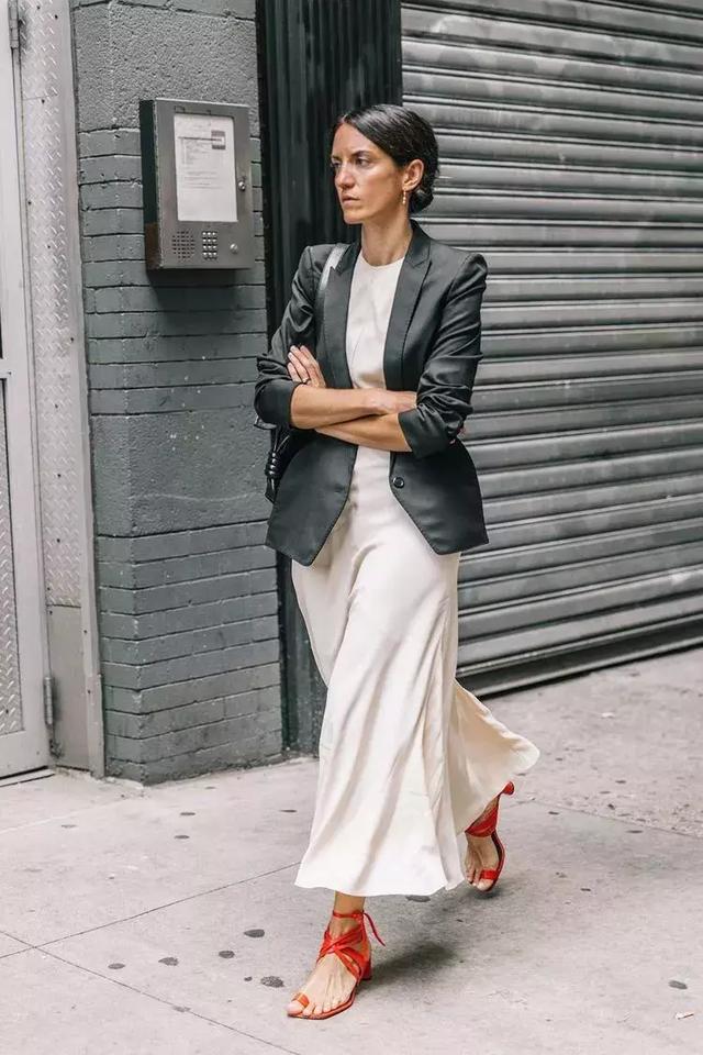 氣場十足的西裝和柔美的連衣裙碰撞起來,不論是吊帶裙還是短裙,都是一套精緻的LOOK~