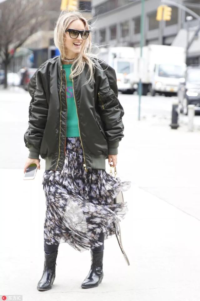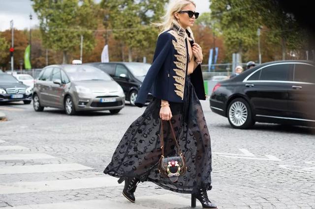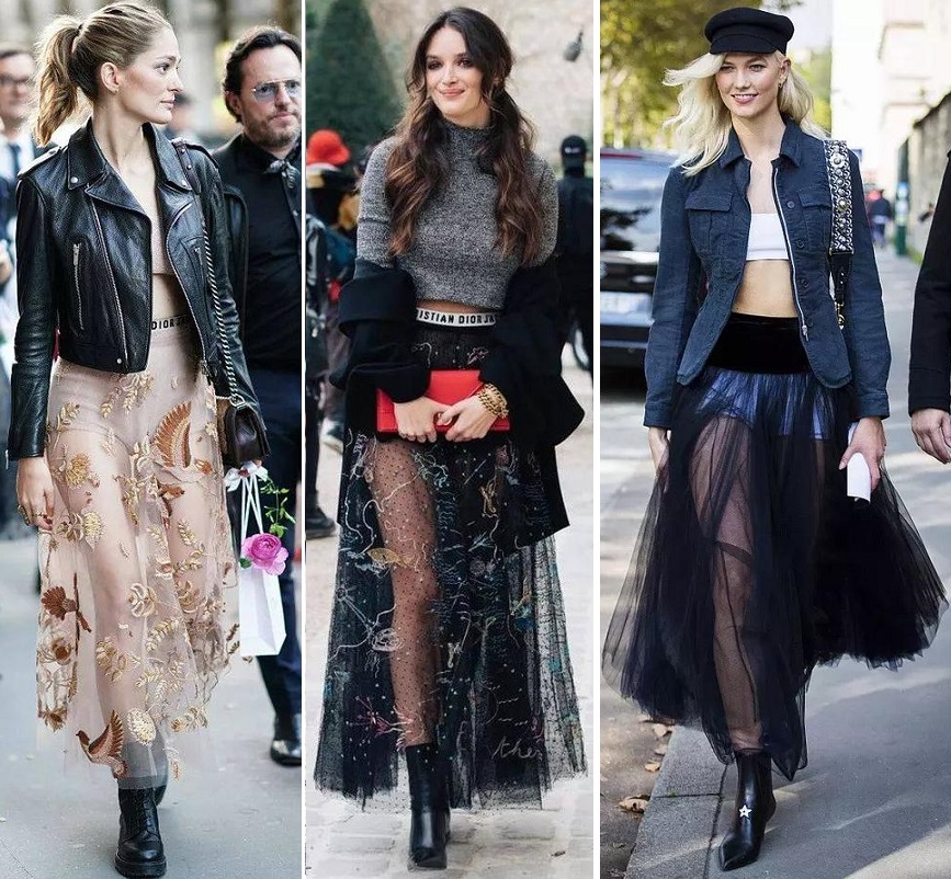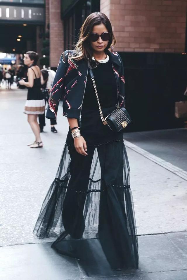 在秋冬季節,紗裙還可以跟硬朗的皮夾克想搭配,紗裙充滿女性氣質,