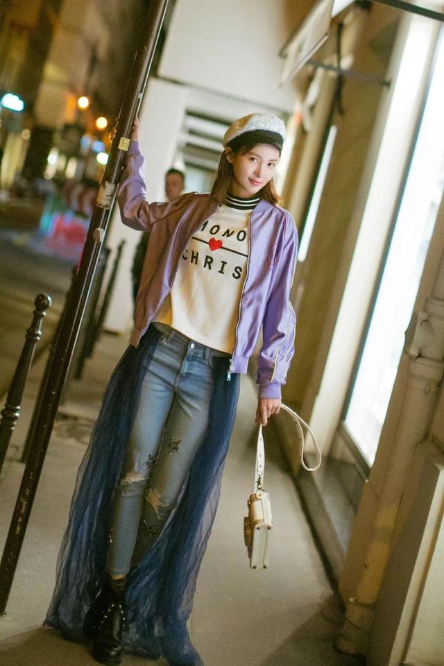神仙姐姐劉亦菲就在就牛仔褲外面套了白色圓點紗裙,很有風格: