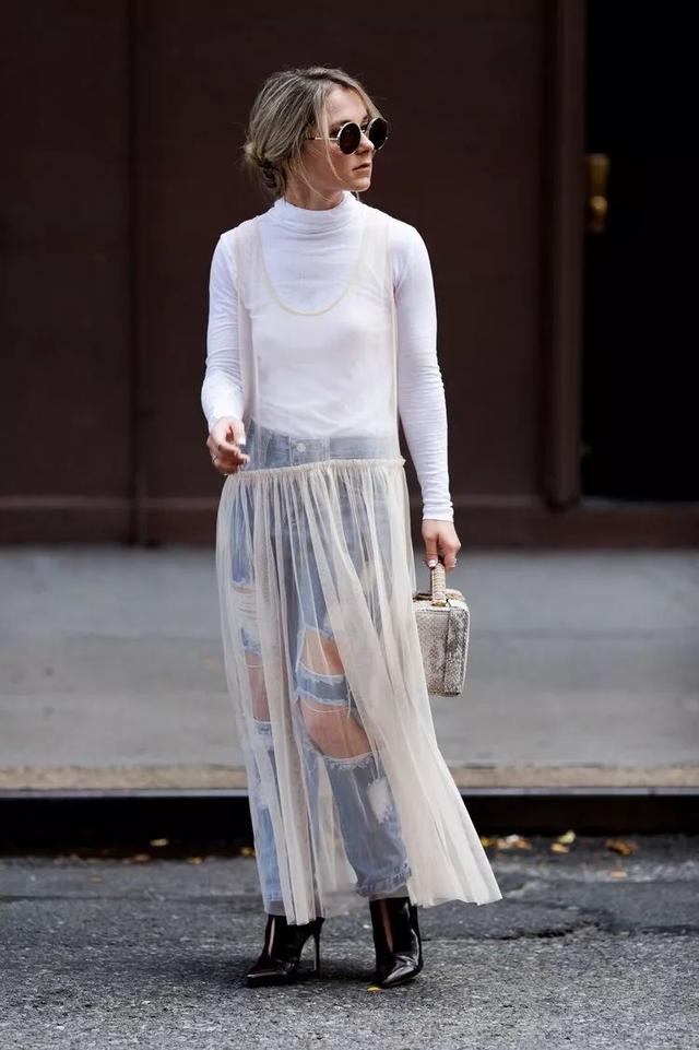 想要嘗試另類一點的穿法,你甚至可以在牛仔褲外面再套上紗裙。