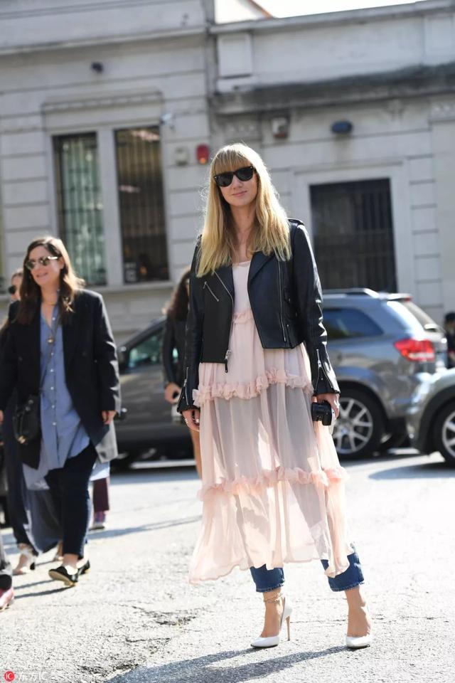 和男性化的皮夾克互相中和平衡,剛柔並濟,集帥氣和甜美於一身: