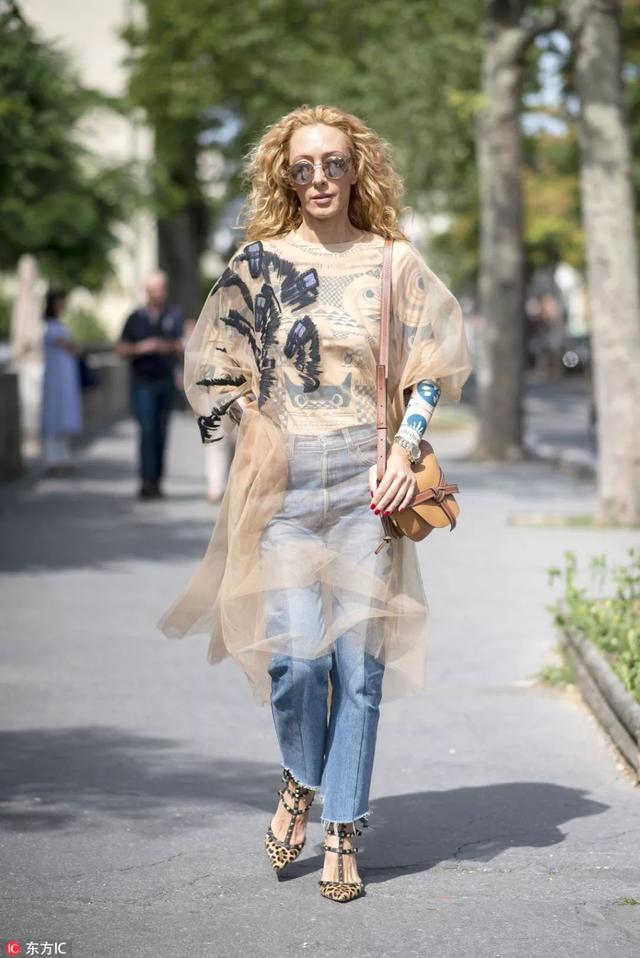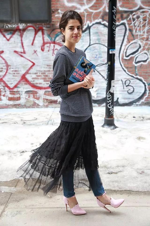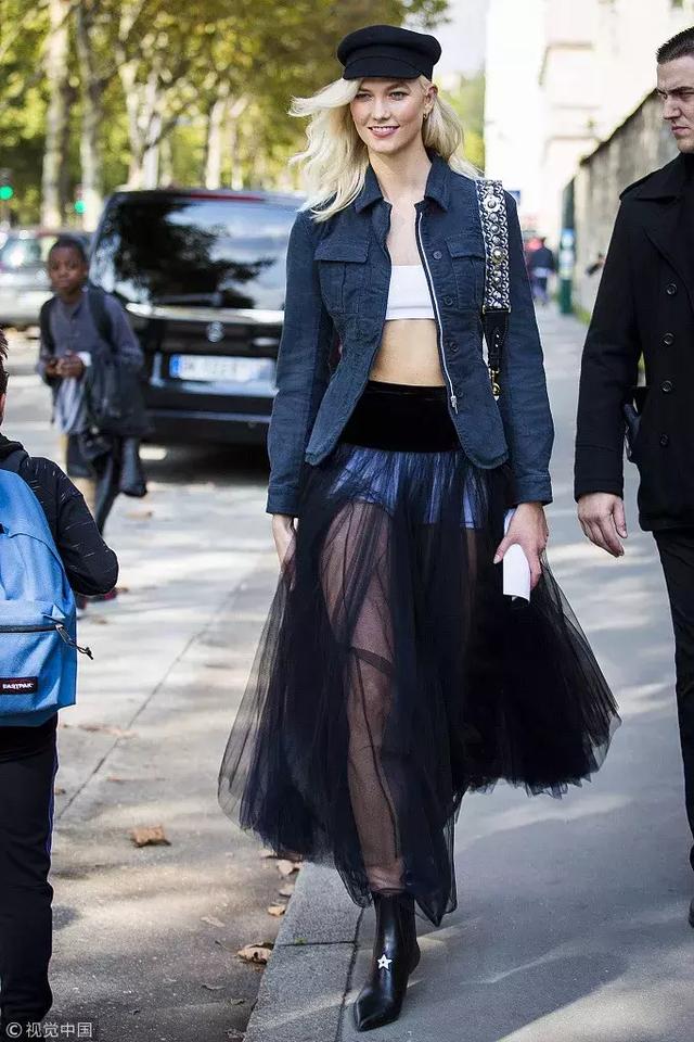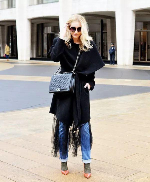 黑色層疊的紗裙也可以和牛仔褲疊穿: