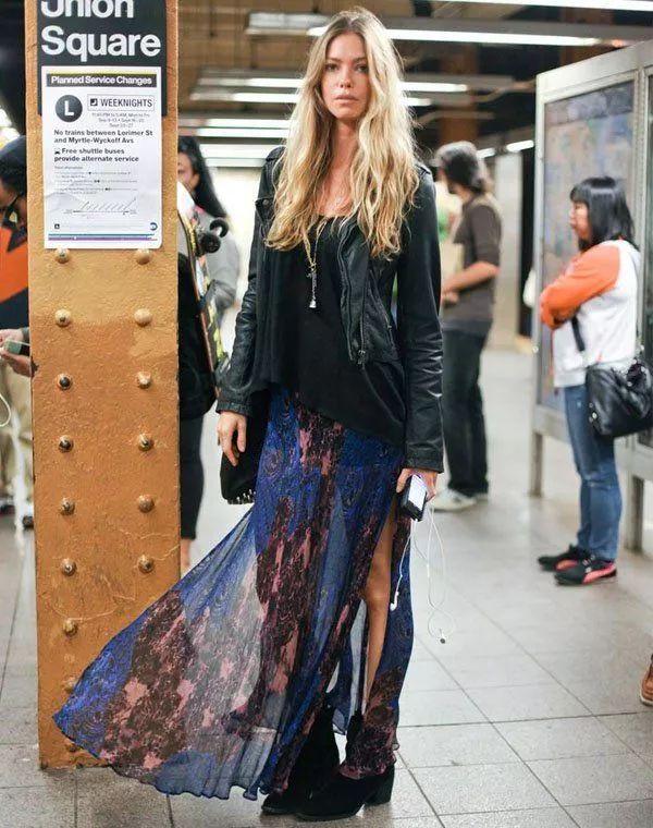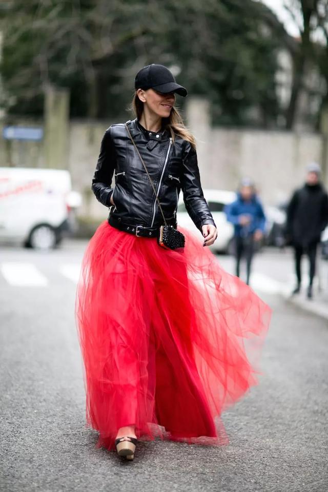 秋冬季節,紗裙還可以搭配機車外套,又帥又美: