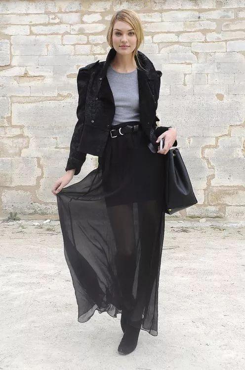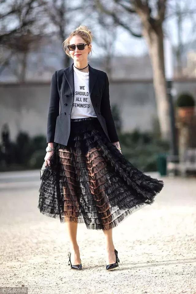 黑色紗裙不一定是純黑,選擇一些蕾絲或者有印花的黑色半裙會更有質感: