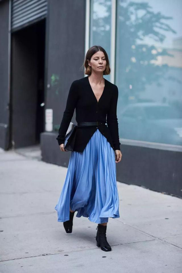 這套“教科書式”的搭配,就是選擇繫起來的針織衫+百褶裙,呈現出來成熟女人的溫柔感。