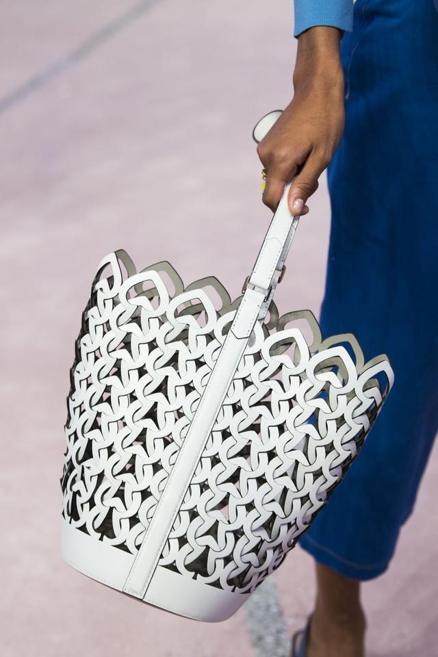 至於Kate Spade的手提包包,那是許多人成長的回憶,這次她帶來的設計裡,一個是泡泡糖粉紅色,手掌大小,帶一個鐵鍬扭鎖,而另一個是由堆疊的黑桃符號製成的籃子包。