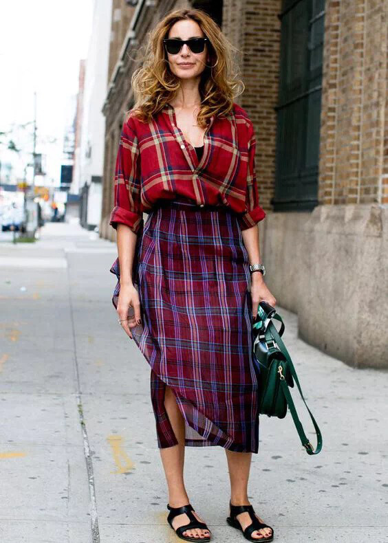 相對安全的穿法,也是選擇色彩相近的格紋單品進行搭配,