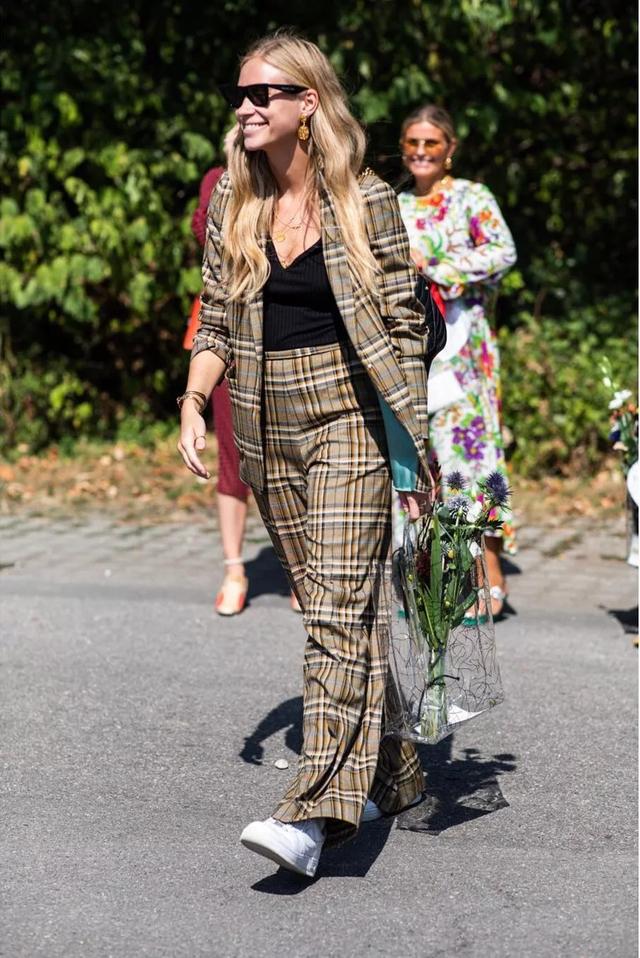 廓形感的墊肩或者落肩設計的彩色格紋西裝,讓上松下緊的搭配更有層次感。