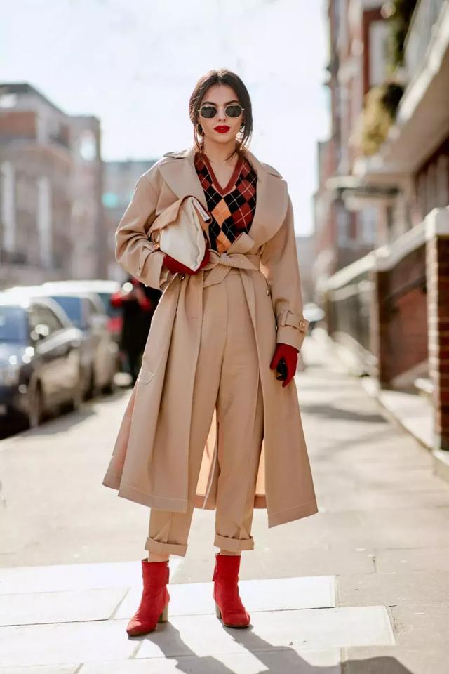 風衣和短裙同色系搭配一雙紅色長靴,簡潔Look會讓讓看起來更精神,