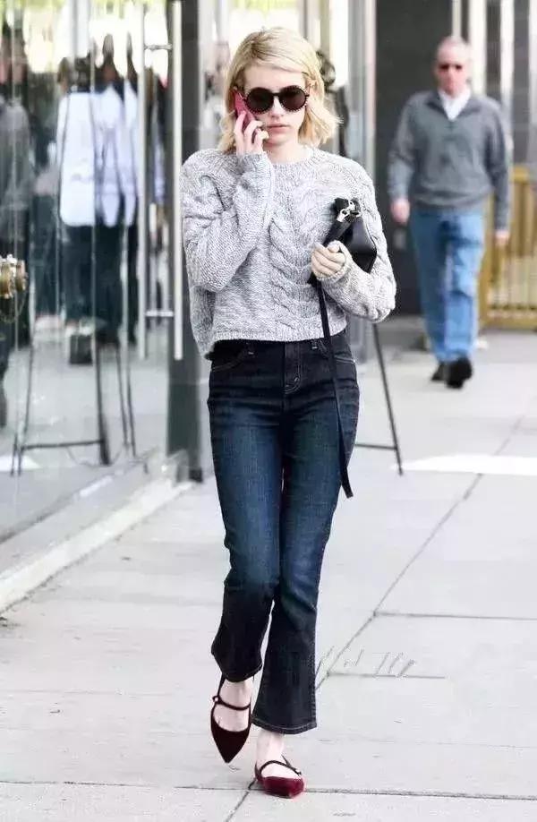 誰說微喇褲顯矮?一米五七的Emma Rorberts,搭配短款毛衣,身材比例照樣完美!