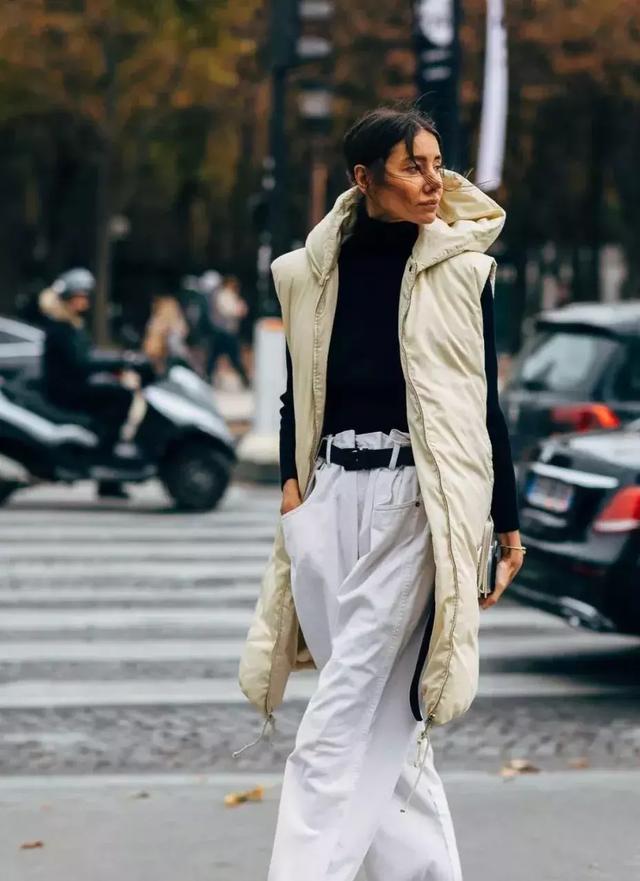 這種背心雖然沒有高領款那種縱向拉伸的視覺效果,但是勝在樣式簡單,反而在視覺面積上更減少了羽絨服的臃腫感。