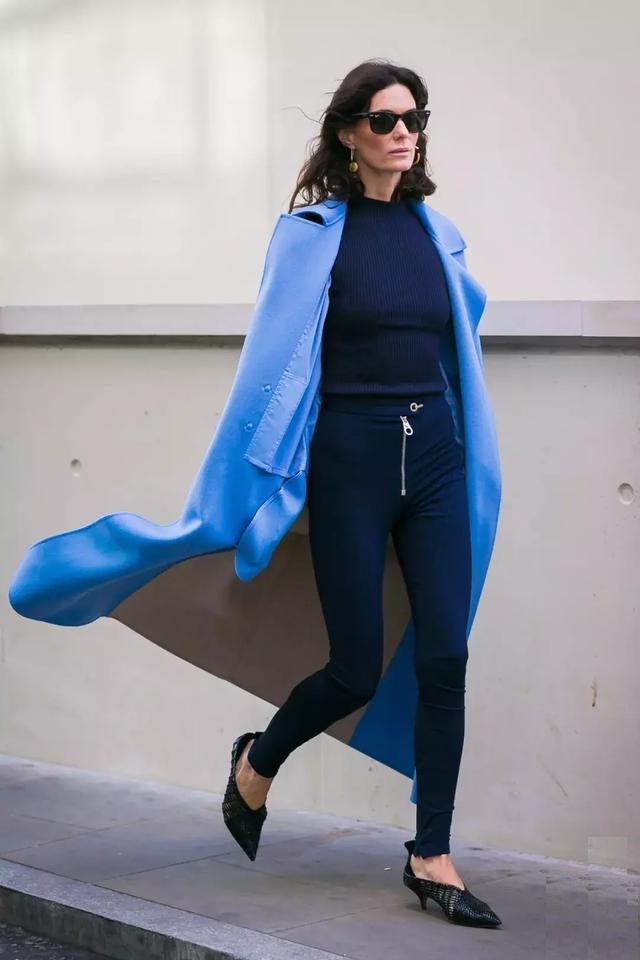 藍色大衣還特別適合同色系搭配。像紅色、綠色那些穿一身會讓人覺得太滿,濃得化不開,但中性色的藍色不會。▼