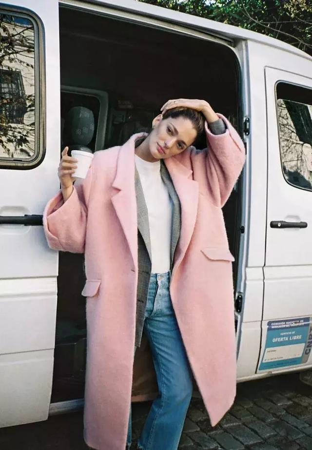 這種很淺很淺的粉色大衣還蠻容易買到的,它會更顯膚色,也挺大氣。▼