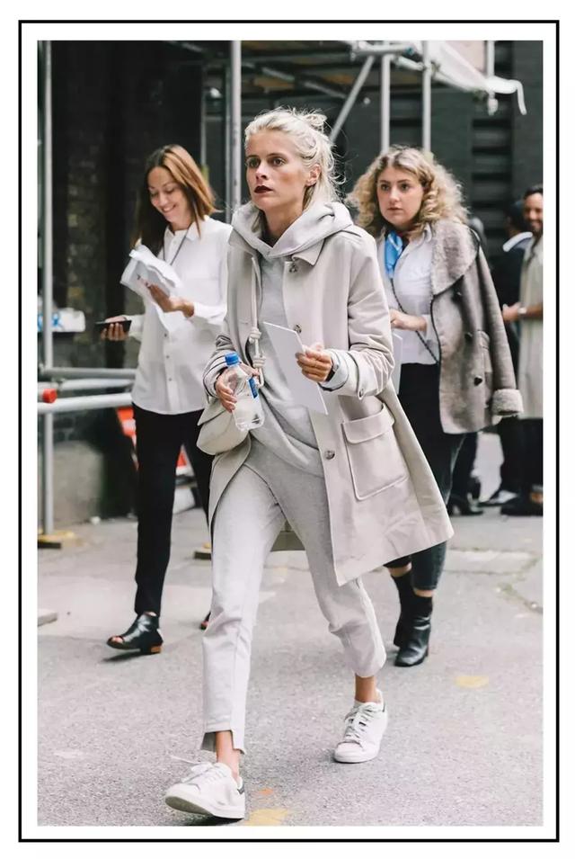 衛衣+褲裝+風衣也適合敞口穿。穿風衣選褲子比較自由,你不必擔心腿型問題。