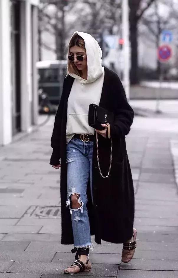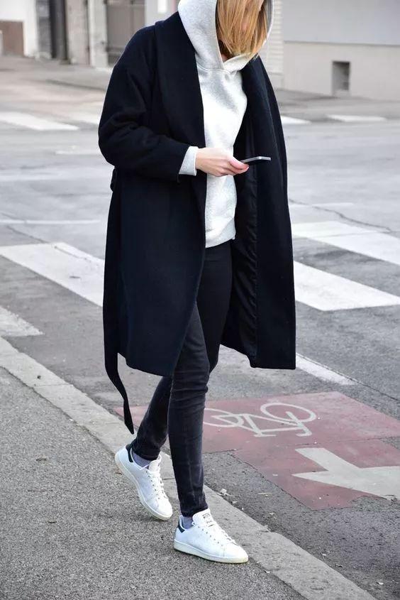 除此之外,黑、白、灰大衣也可以拿衛衣來配,感覺並不挑身材和顏色,