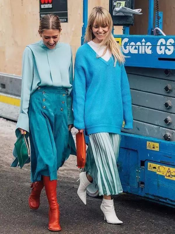 選擇同色系藍色出街,可以學習大表姐的略微神秘淺淡的海藻藍色,無形中增添的沉穩大氣,提升衣品時髦度色。