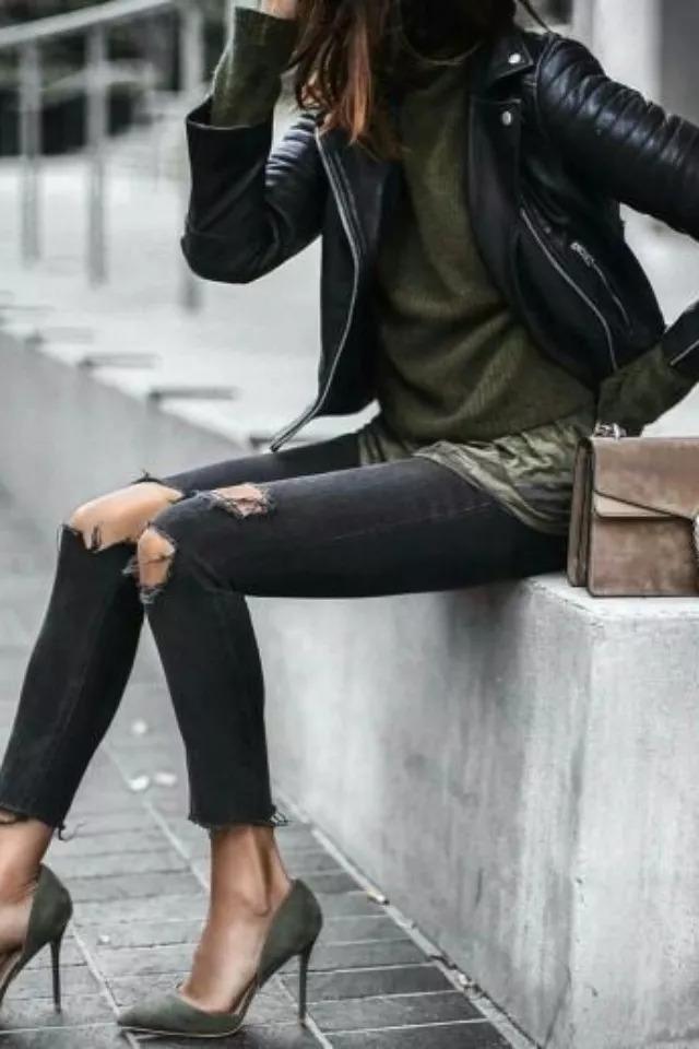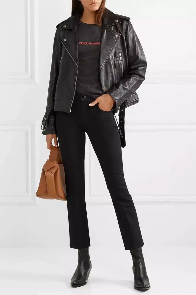 雖然黑色的皮質衣百搭,但要打破冬日的沉悶感,還是要活潑的牛仔褲來呈現,加上短靴就能美帥美帥出街。