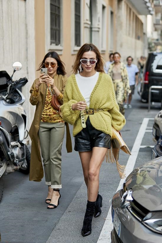 來個大膽的撞色,是極具挑戰性的,想綠色的針織衣搭配橙色的半身裙,整體自帶光澤度。