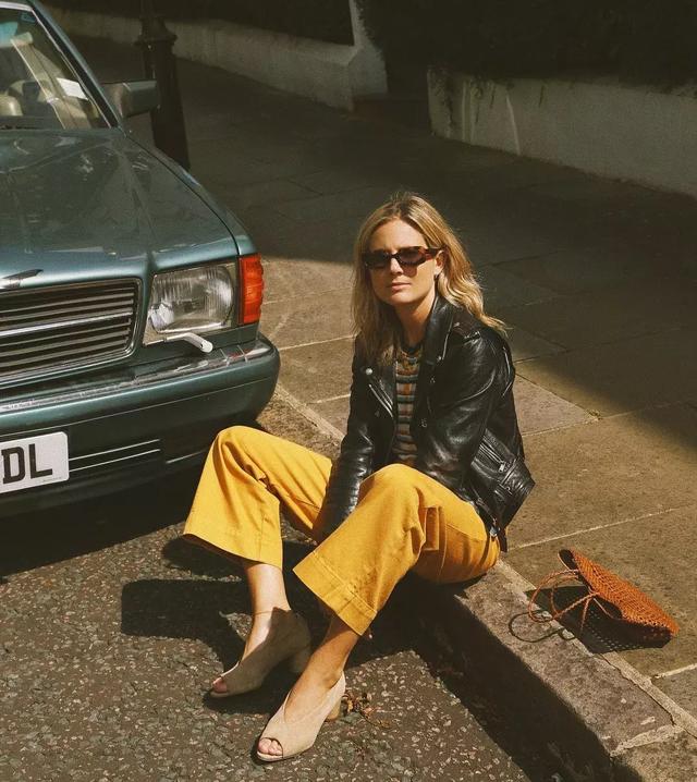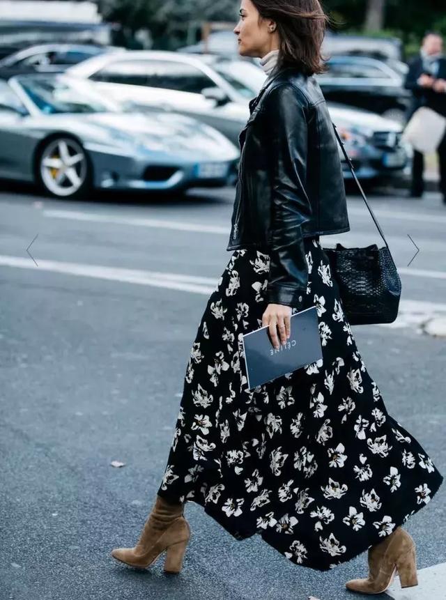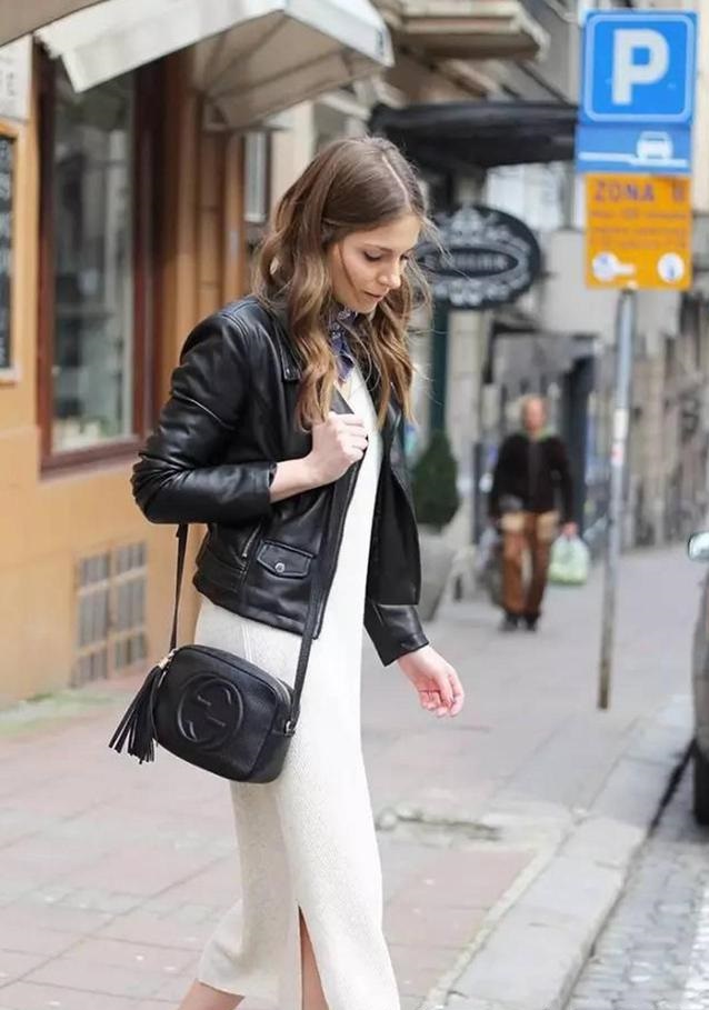 彩色的條紋連衣裙,亮眼又富有復古風,外搭帥氣的夾克衣,那種自由不羈的瀟灑性,表現的淋漓盡致。