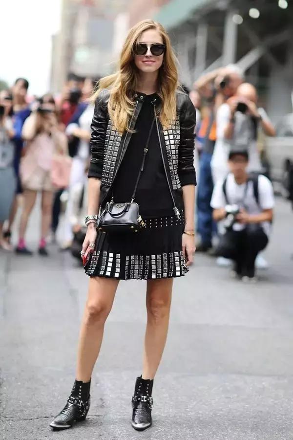 一身黑色的裝扮,顯得中性硬朗,而裙子的搭配讓整體加深女性美。