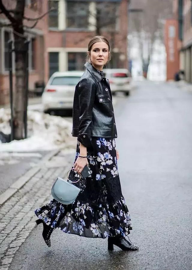 厚實的羽絨服搭配印花綢緞裙,這樣的混搭方式也顯得和諧,兩者相輔相成更耐看。