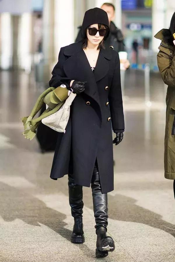 樸信惠身穿硬皮皮毛一體大衣搭配過膝靴,溫暖措施做到的同時氣場一點也不輸。