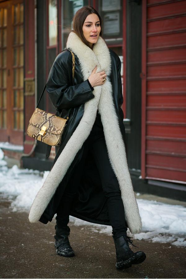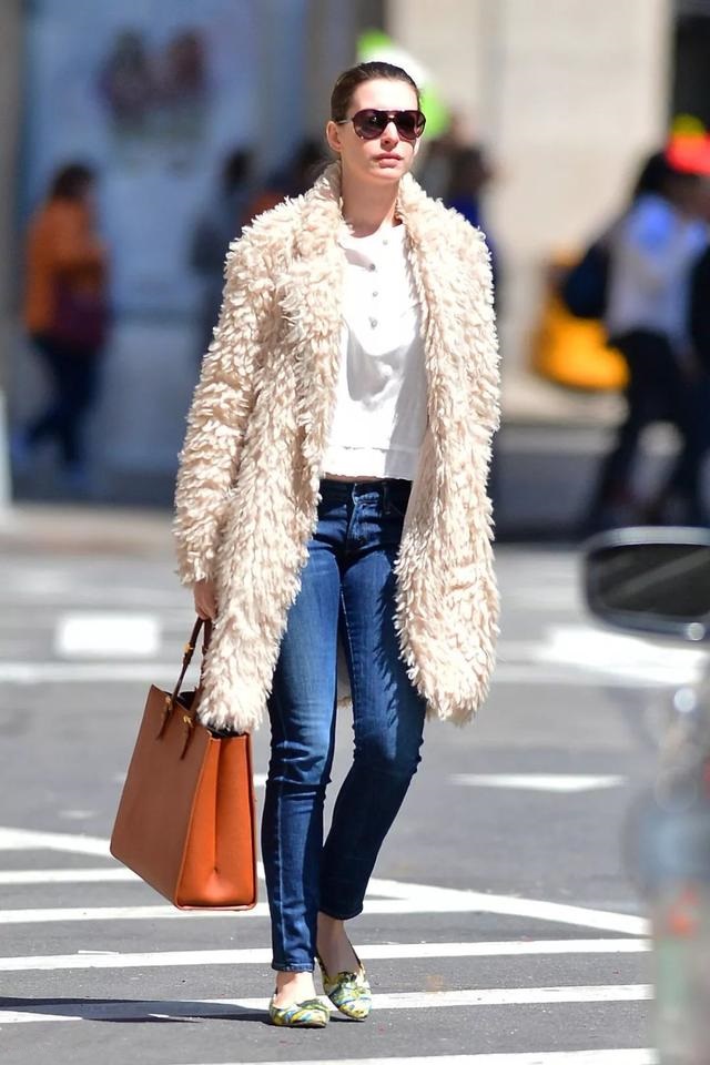 天生帶有oversize廓形的皮毛一體大衣,非常適合搭配skinny jeans,這樣可以反襯得雙腿更加纖細!