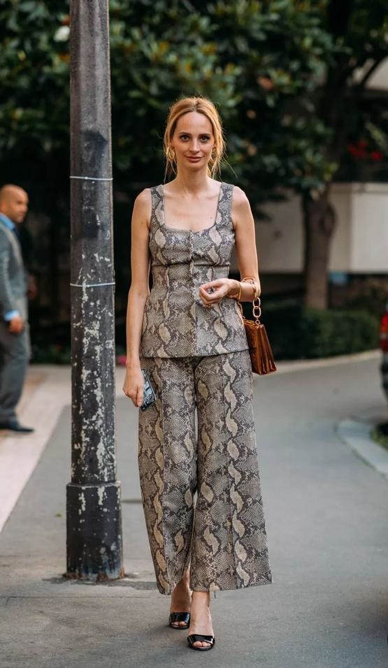 蛇紋長褲有一種蠱惑力,與簡約黑白色調的上衣搭配,是酷也是一種灑脫。