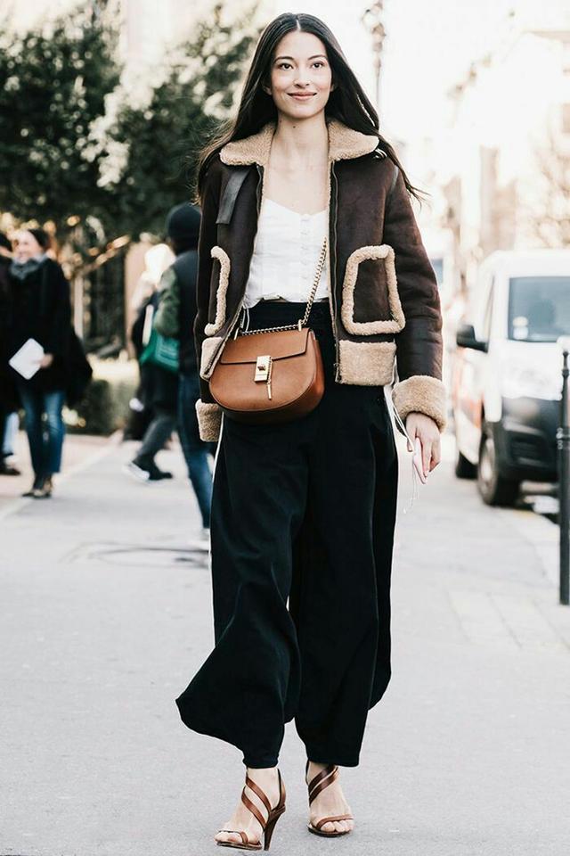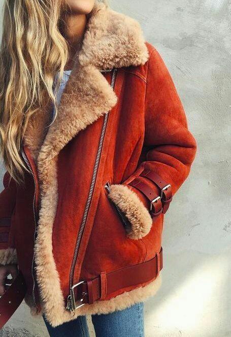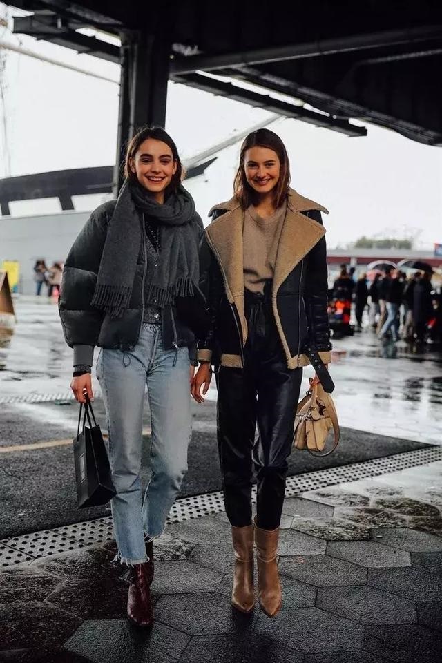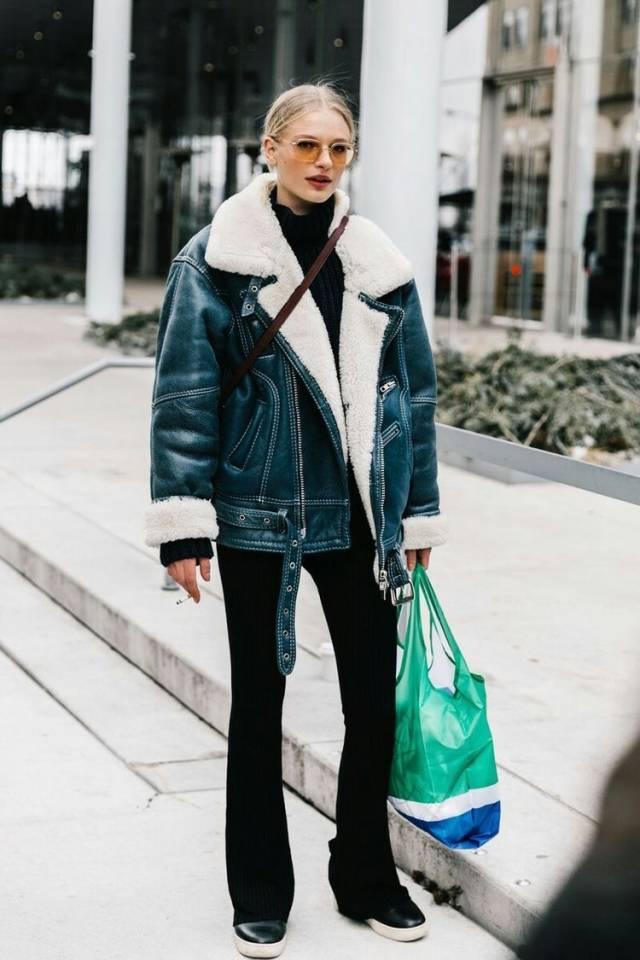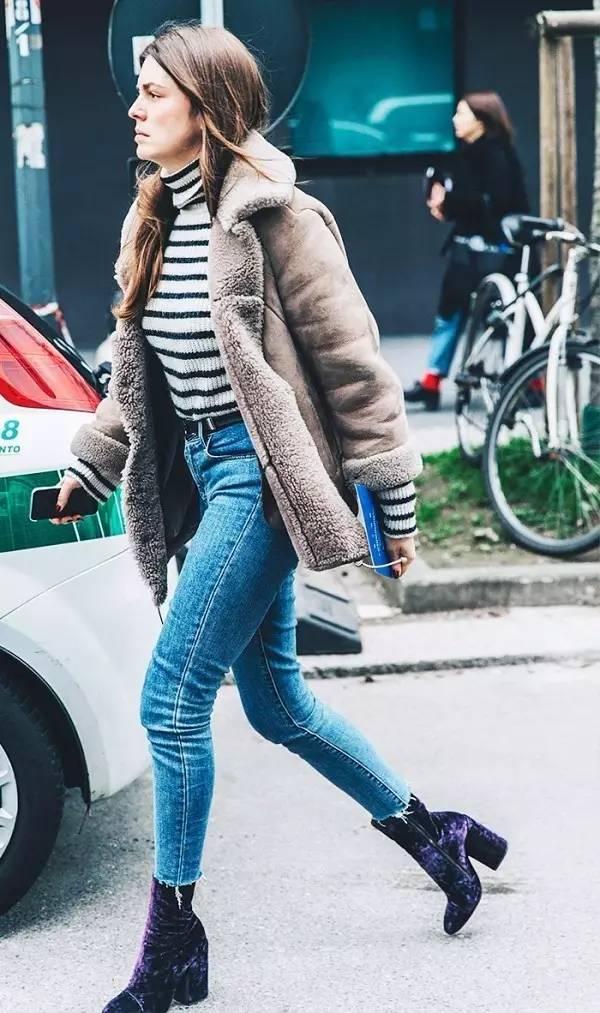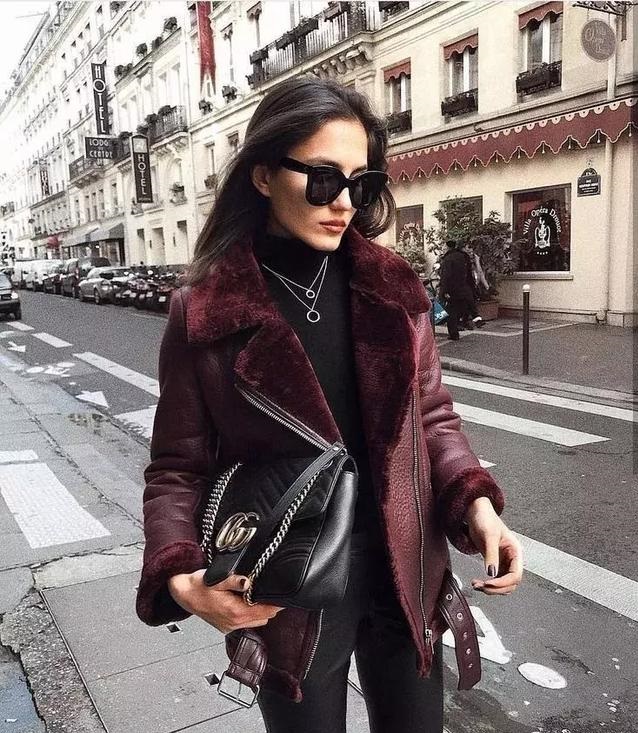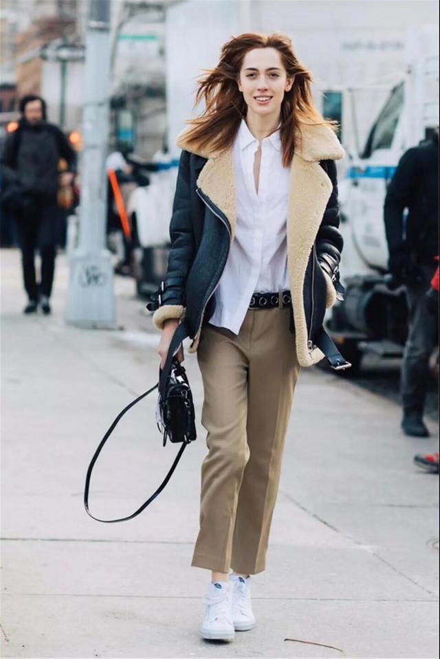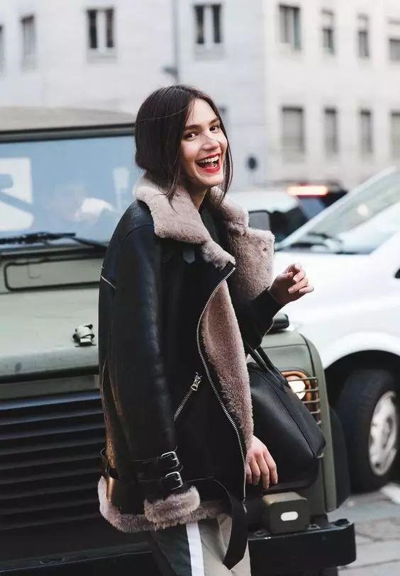 毛翻領皮夾克保留了皮質的帥氣,袖口和下擺的毛毛起到了很好的裝飾提亮作用,內搭高領拉鍊針織衫,穿雙短靴配小喇叭褲就足夠有型。
