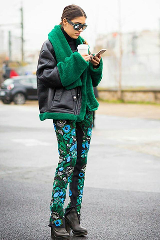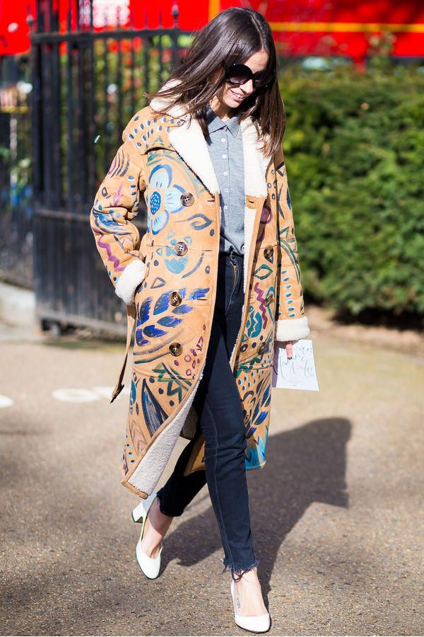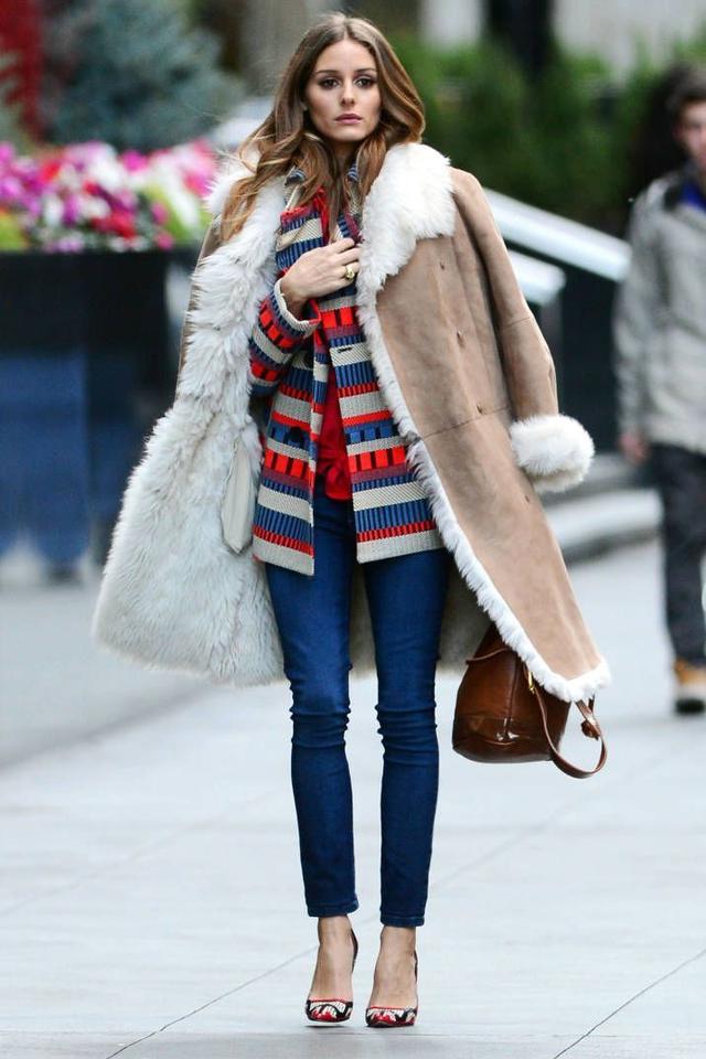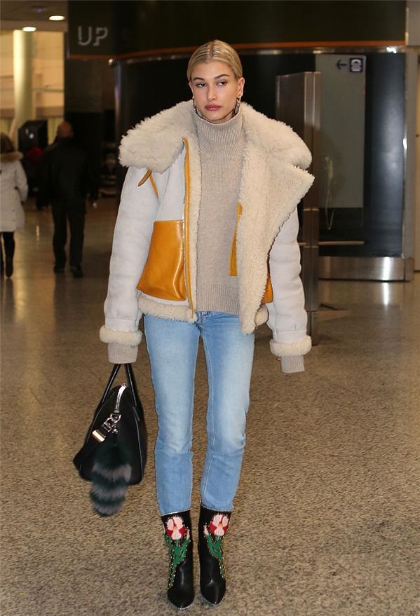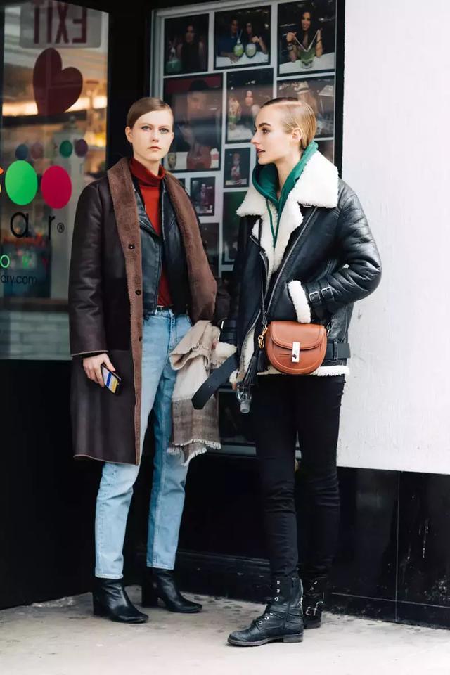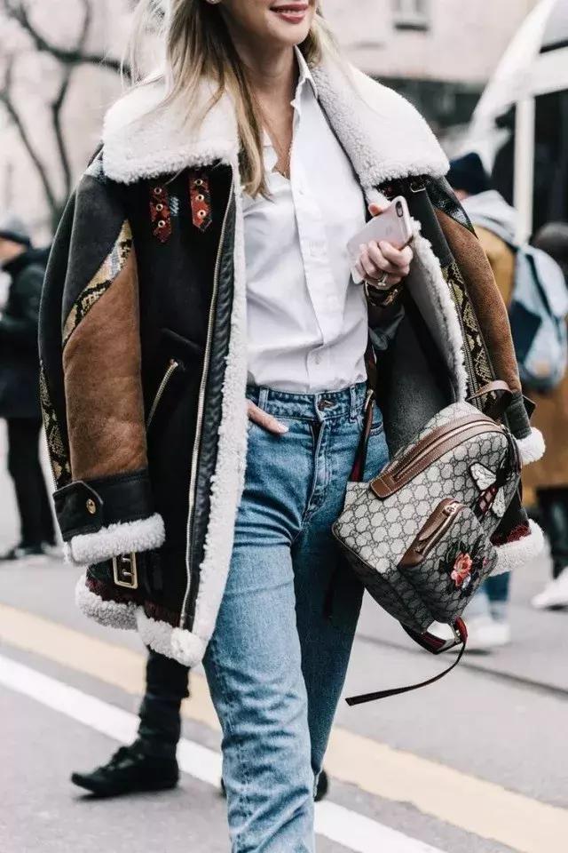 牛仔褲的流蘇邊增加隨意感,一隻編織小手包和大體量的翻毛夾克對比十分俏皮。