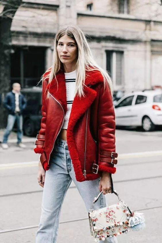 想要與眾不同的話可以選擇黑白以外,顏色更加靚麗的夾克,楓葉色的皮面就是不錯的選擇,整件外套足夠吸睛,襯衫塞一半露出腿部,白靴子和白色毛毛以及打底T卹呼應層次豐富。