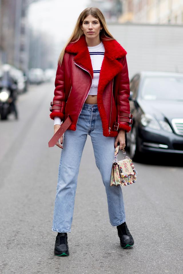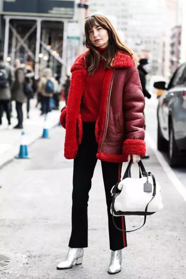 紅色毛毛的款式非常少見,內搭點到為止即可,和牛仔褲一起帶走冬天的灰暗,十分有活力。